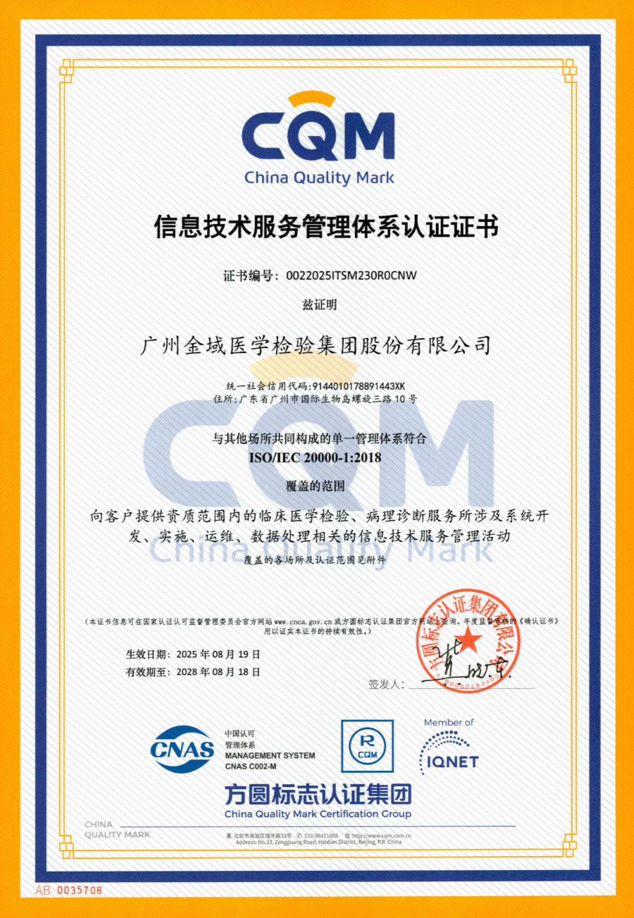 近日,金域医学(603882)集团总部及旗下广州金域、郑州金域等13家子公司顺利通过ISO/IEC 20000信息技术服务管理体系认证(含CNAS认可标识),标志着金域医学在信息技术服务管理领域的标准化、规范化和国际化水平获得权威认可,彰显了公司在数字化服务和客户支持方面的卓越能力。